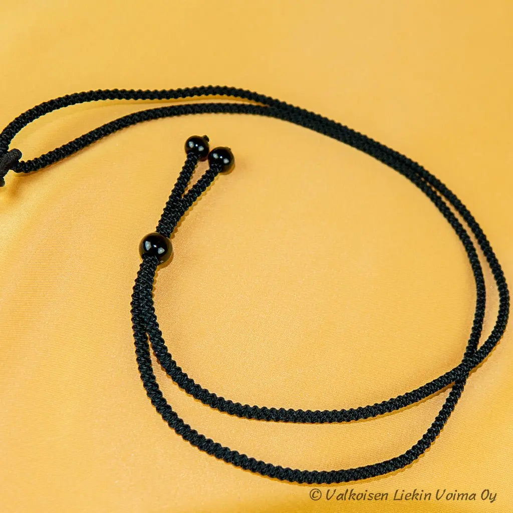 Kaulanauha on polyesteriä, sen pituus on 70cm ja se on säädettävissä kolmen mustan onyx -kristallihelmen avulla. Siiven koko on noin 5cm ja kolmen lapis latsuli kristallihelmen kanssa noin 7cm. Ei mitään metalliosia, joten allergisetkin saavat nauttia täysin tästä kaulakorusta.