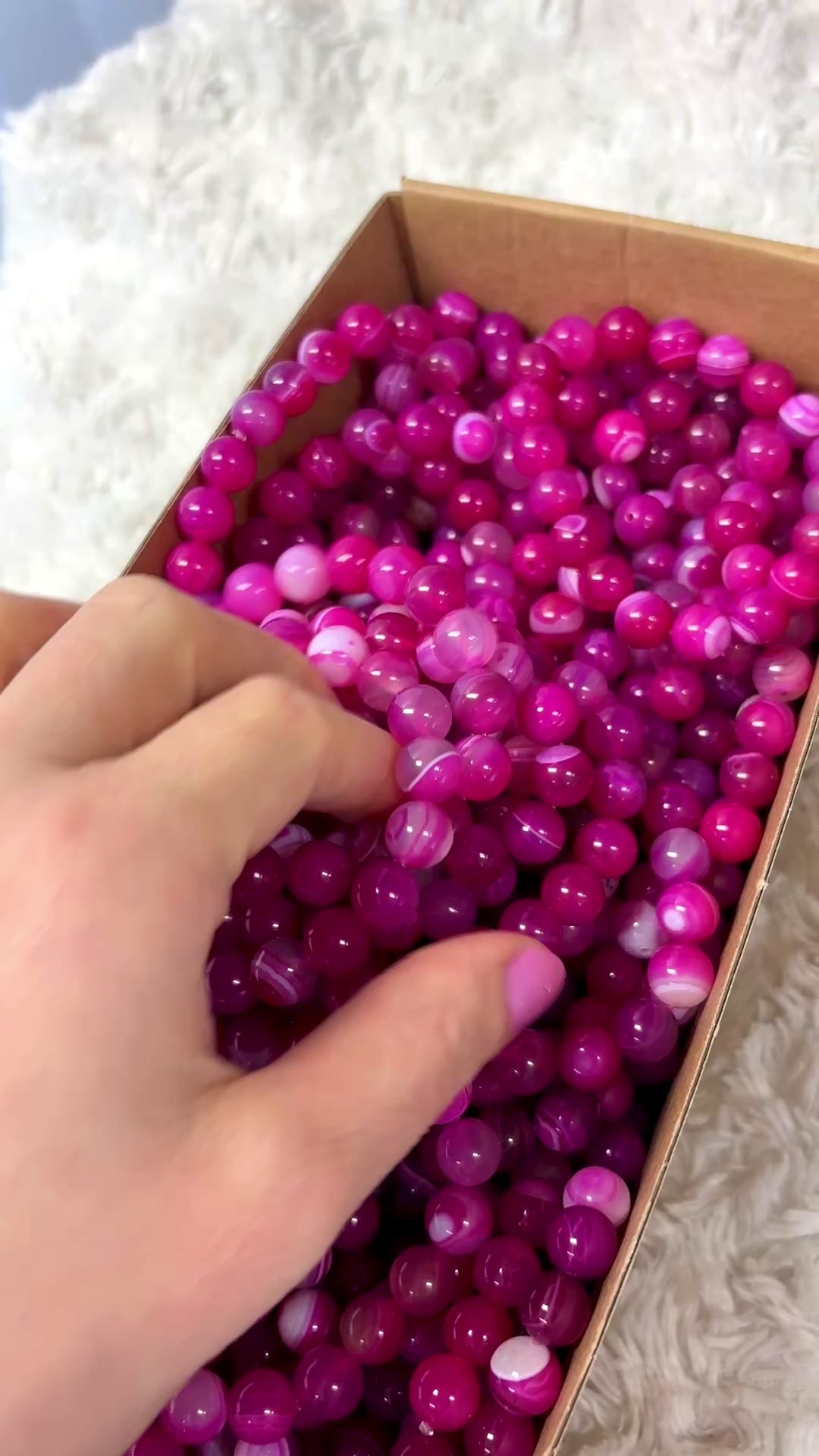Huom 🩷 Koska materiaalina on luonnonkivi, voi joissakin helmissä olla pieniä uurteita, koloja tai juonteita. Ne ovat normaaleja ominaisuuksia luonnollisissa kivissä ja kristalleissa. Helmissä voi olla pieniä kokoeroja.