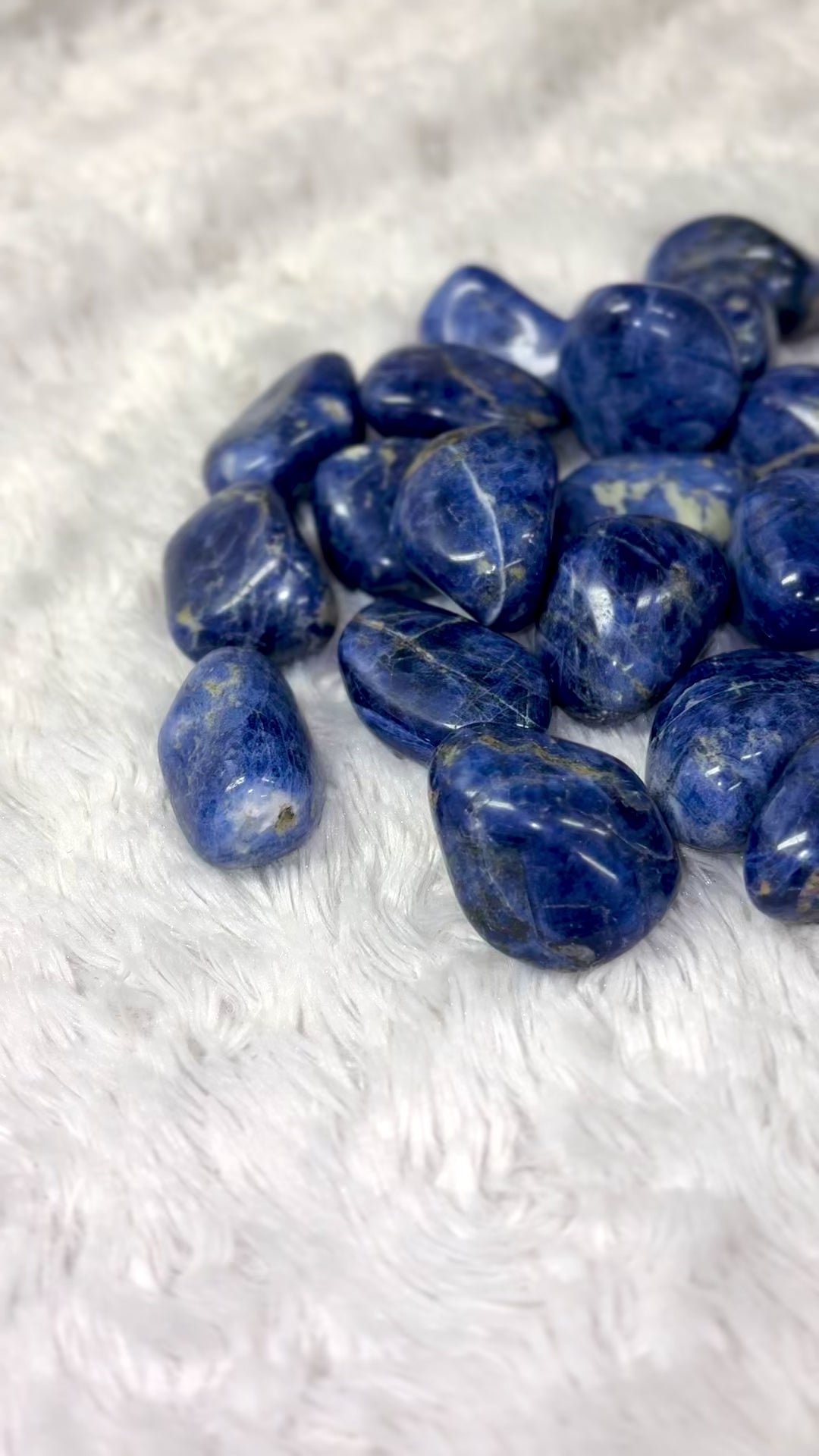 Sodaliitti - Kämmenkivet ovat tummansinisiä, ja niissä on ohuita kalsiittijuovia sekä joissakin hieman pyriittiä, kuten kuvassa ja videossa näkyy. Laatuluokitukseltaan sodaliittikämmenkivet ovat A -laatua 💙
